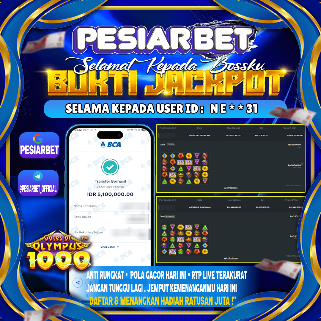 Selamat Kepada Id : NE**31 di di Atas Withdraw Rp 5,100,000 Juta Hari ini. Ditunggu Withdraw Selanjutnya dan ajak juga teman temannya bergabung di Pesiarbet.